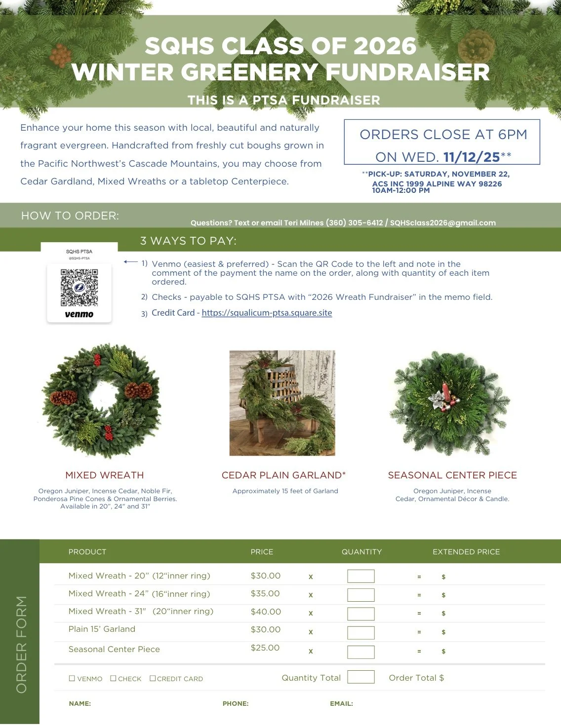 Accepting presales for seasonal greenery orders through November 12th. Items need to be picked up Saturday November 22 from 10 - 12 at ACS INC 1999 Alpine Way 98226. Orders can be made via this website (under shop) or you can pay via venmo (SQHS-PTSA), please note in your venmo what you are ordering and quantity.